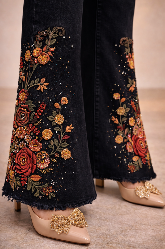 Embroidered Lace Panel Denim Trousers