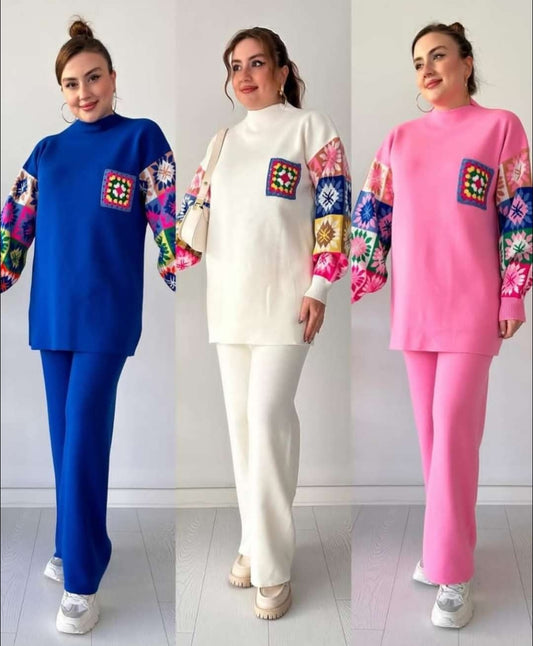 Hollow Out Lace Blue Flare Sleeve Short Crop Top + Pencil Pants Co ord